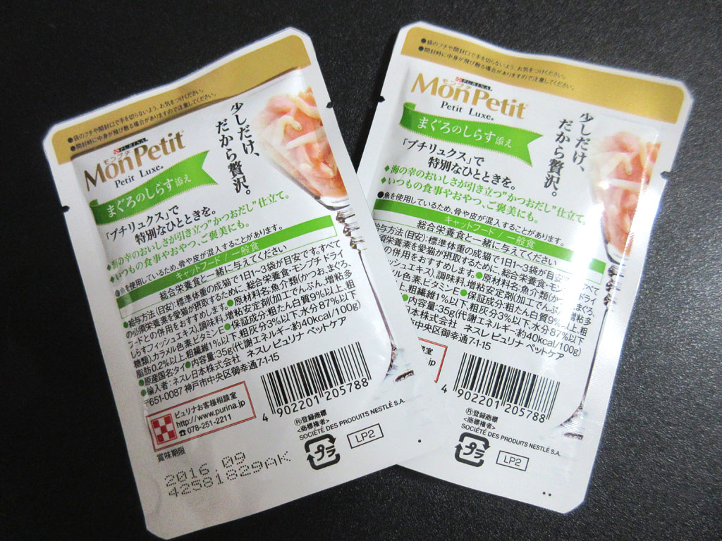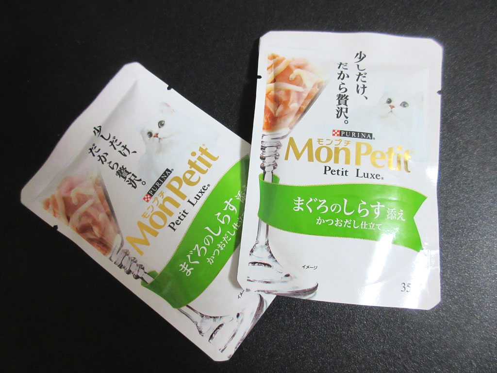 まぐろのしらす添え かつおだし仕立て。この日のアビのすけのラッキーご飯は、モンプチのパウチ、「まぐろのしらす添え かつおだし仕立て」でした。