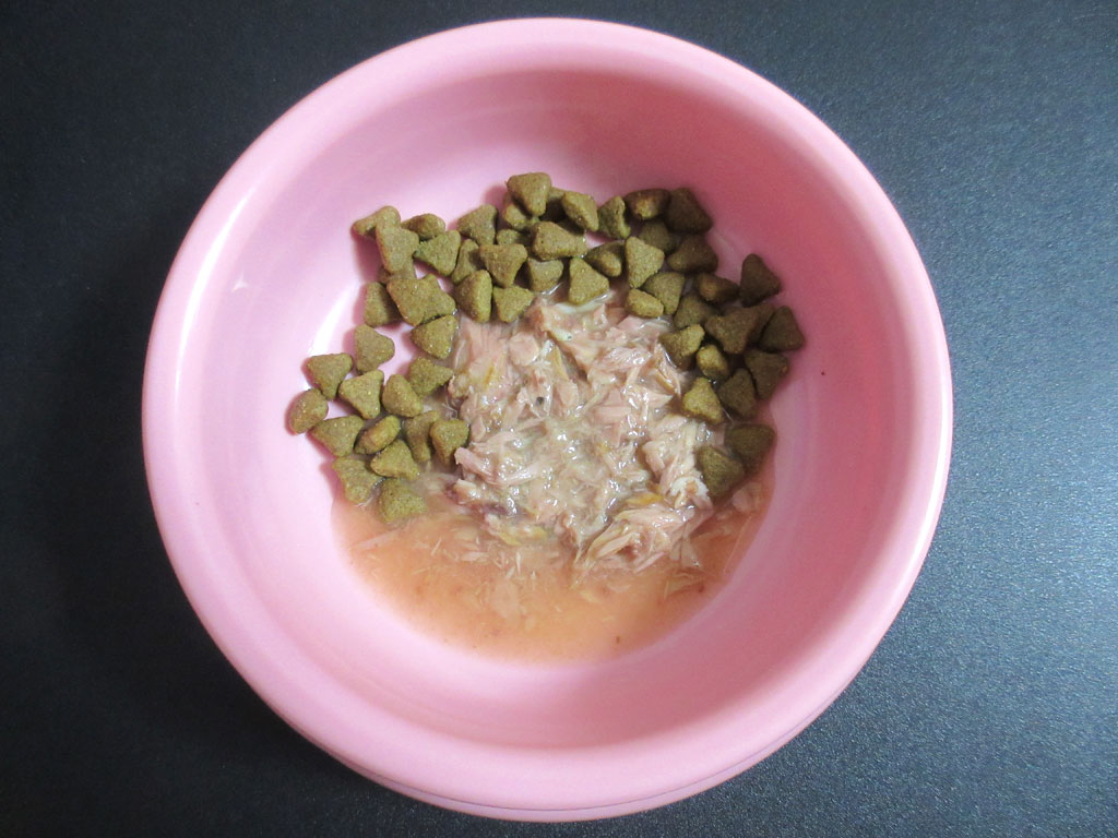 セパレートしたご飯。そして、アビのすけに上品な盛り付けは必要ないのですが、いつもは、パウチの上にカリカリを乗せて混ぜ混ぜご飯にしているのですが、今回は、ロシ子と同じ様に、パウチとカリカリをセパレートして、アビのすけに出してあげました。
