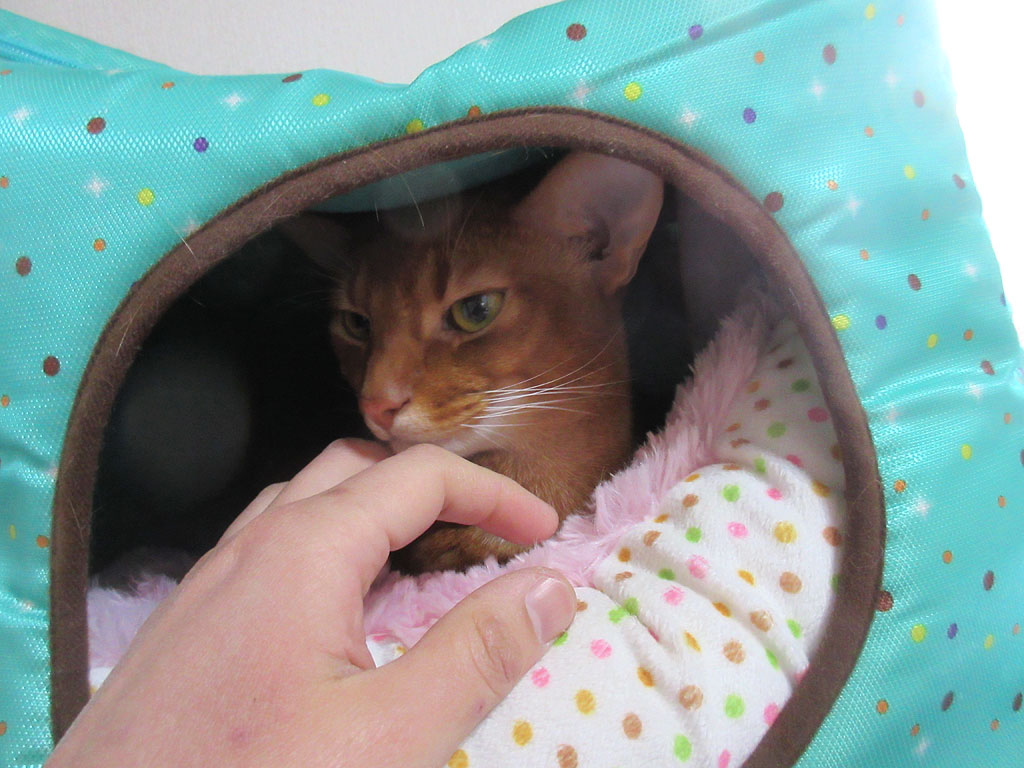 そしてこれは、今日のアビのすけの様子…、この夏用のキューブボックスで作った特製猫ベットは、ロシ子お姉ちゃんを追いやって、完全のアビのすけの陣地になってしまった…。