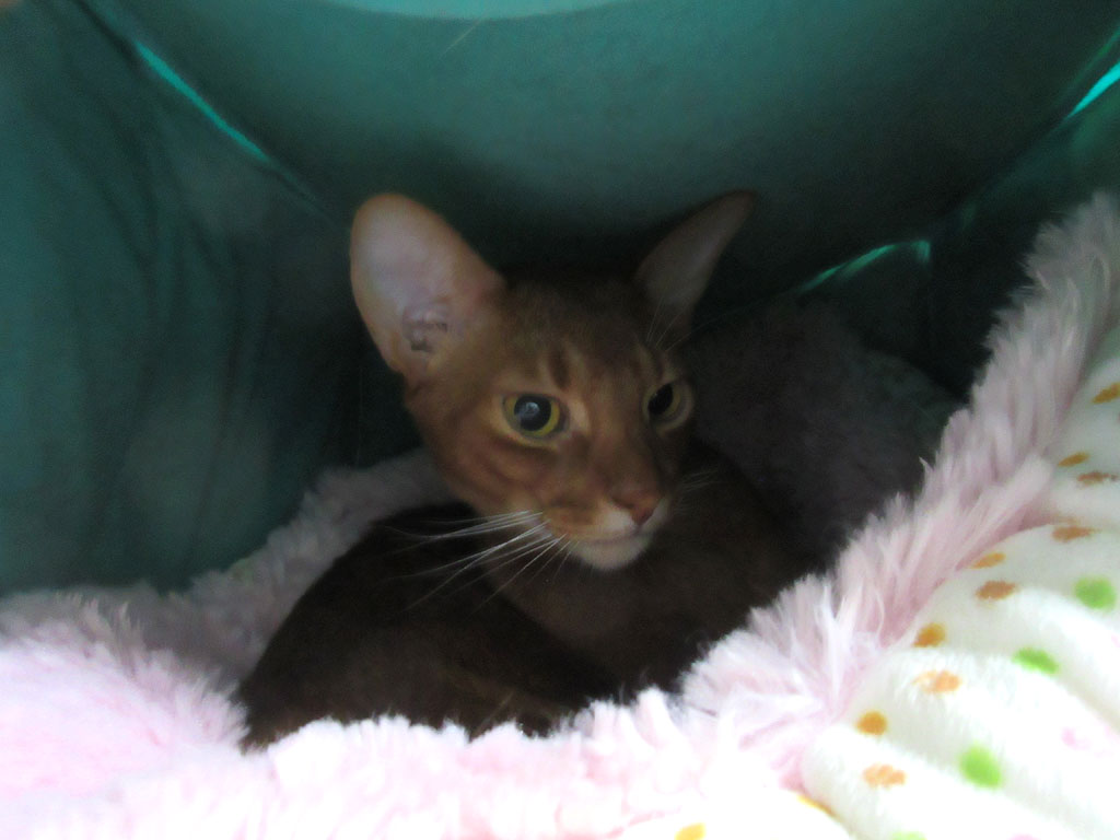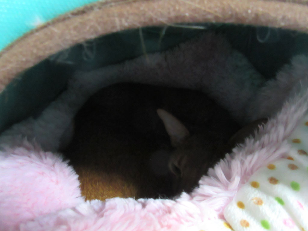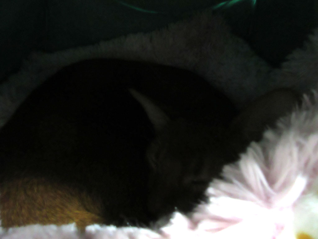 そしてこれは今日の夕方…、アビのすけがこの特製猫ベットの中で寝ていたのですが、写真が暗いけど、アビのすけが見えるかなぁ〜…?