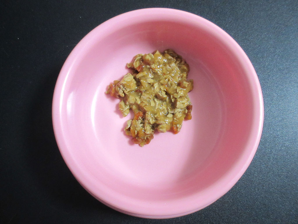 パウチの中身はこんな感じ…、このラ・キュイジューヌのパウチは、内容量が85gもあるので、ロシ子のアビのすけとで半分ずっこにして出してあげました。