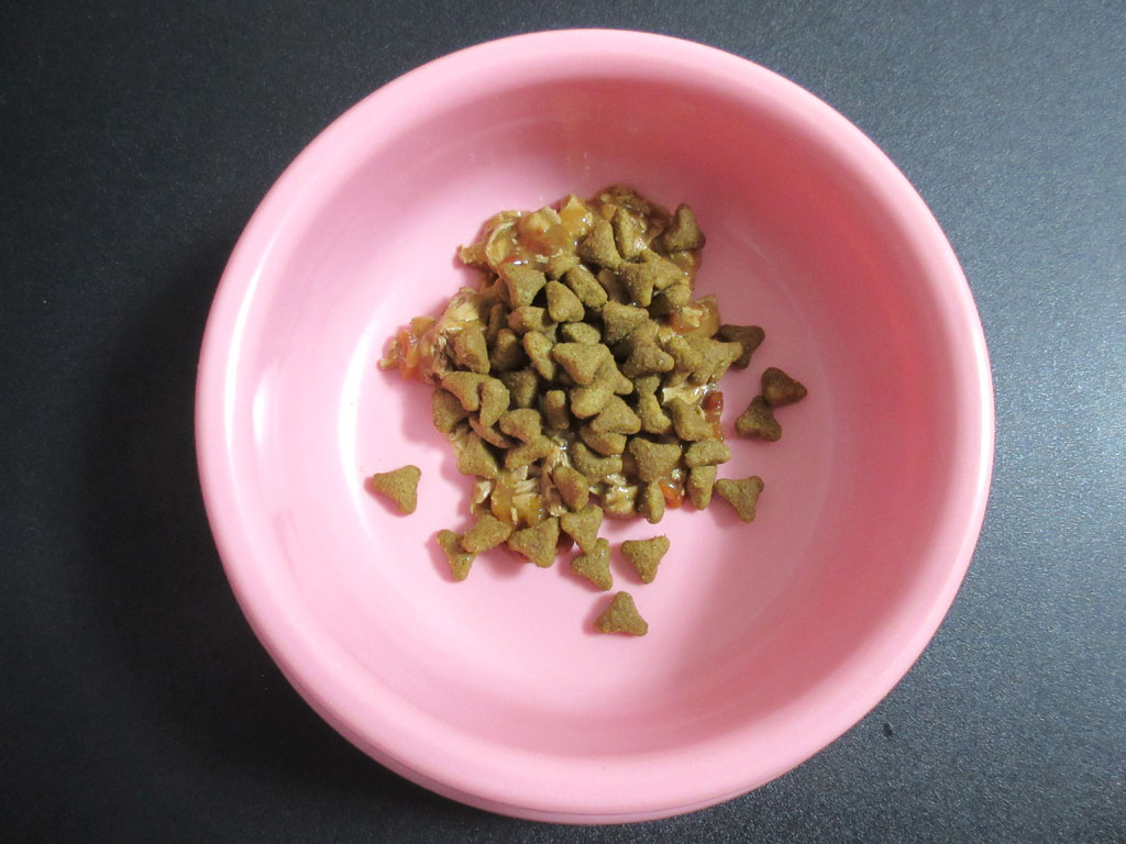 そして、パウチの上にカリカリを合わせて、簡単ではありますが、アビのすけの記念日ご飯の完成です。