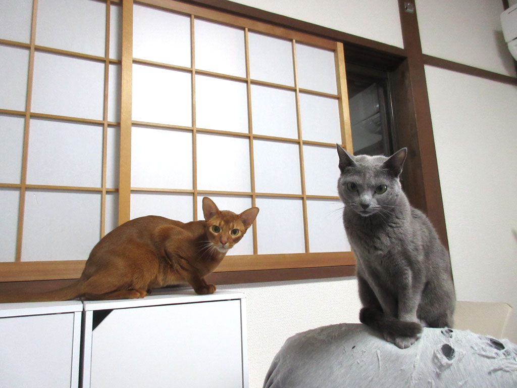 しっかり猫のお姉ちゃんのロシ子と、やんちゃで落ち着きがなく、何にでも首を突っ込みたがるアビのすけ…、そんな2にゃんの性格が現れている写真だと思います。