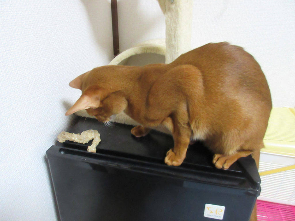 アビシニアンとゲロ。いつもは悪戯ばっかりしているアビのすけに、こんなに弱っちい所を見せられてしまうと、アビのすけがかわいそうでかわいそうで…、大丈夫かい…、アビのすけ君…。