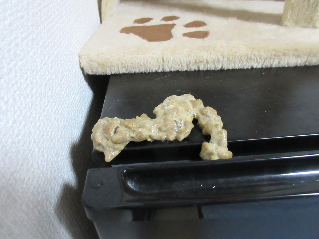 カリカリがそのままのゲロ。汚い写真で申し訳ないのですが、よく見てみると、カリカリが固形のままの状態で吐いているので、慌てて食べたから吐いてしまったのかい…?