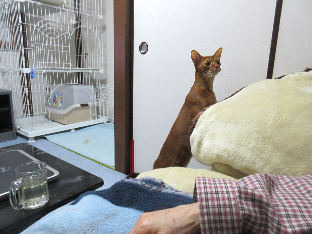 そしてこれはおとといの事ですが、この日、私の母親が猫たちに会いに来てくれて1泊して行ったのですが、好奇心旺盛なアビシニアンのアビのすけは、ちょっと警戒しながらも、それを上回った好奇心でこんな感じ…。
