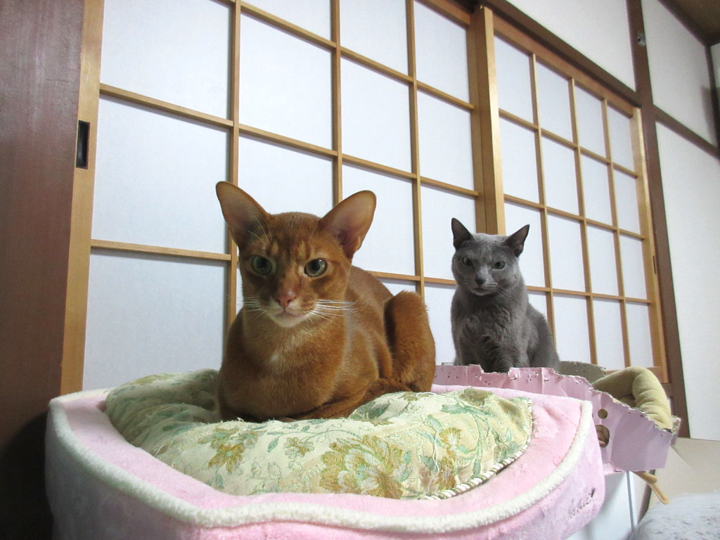 走り回っているアビのすけと、おとなしいロシ子…、ビビりながらも好奇心が旺盛なアビのすけに対して、芯の太い、表面は気弱な様に見えても肝の据わっているロシ子…、こんなに面白い猫たちと一緒に生活が出来て、私は本当に幸せです。