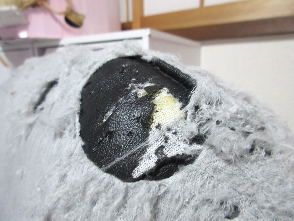 広範囲に破かれている座椅子。思った以上に広範囲の革が噛みちぎられていて、この1日2日で、アビのすけが一気に噛みちぎったのだと思う…、本当に悪戯坊主のアビシニアン…。