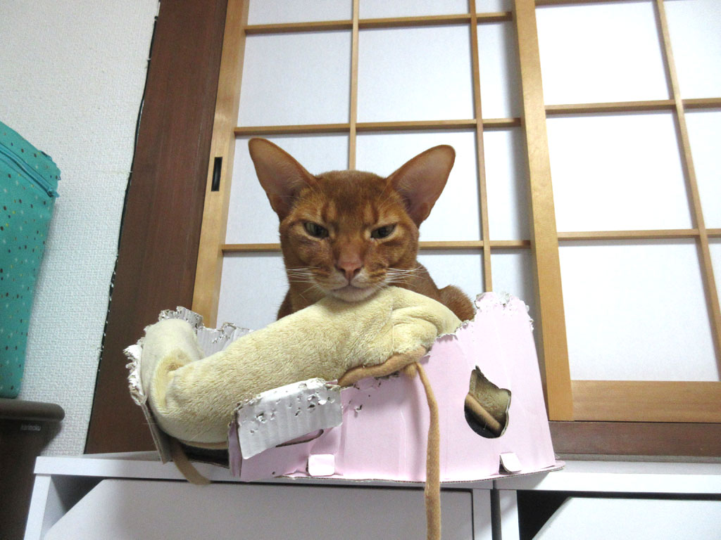 下で戸を叩いても効き目がなくなって来たので、そろそろ直に喝を入れてやらなければと思って、自動給餌器が動き始める時間に、私も猫たちの部屋で待機をして、アビのすけがロシ子の自動給餌器のお皿に顔を突っ込んだ現場を抑えた所で、アビのすけを怒鳴りつけてやったのです。