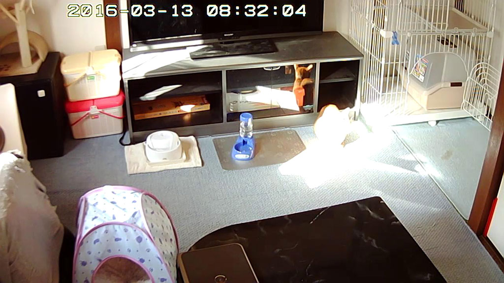 これは、おとといの日中の我が家の猫たち…、アビのすけはご覧の所でスヤスヤ、そして、ロシ子は水色のキャットテントの中でスヤスヤ…。