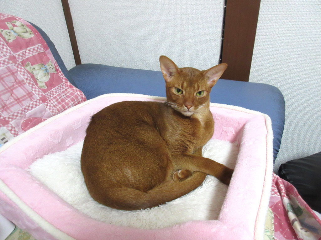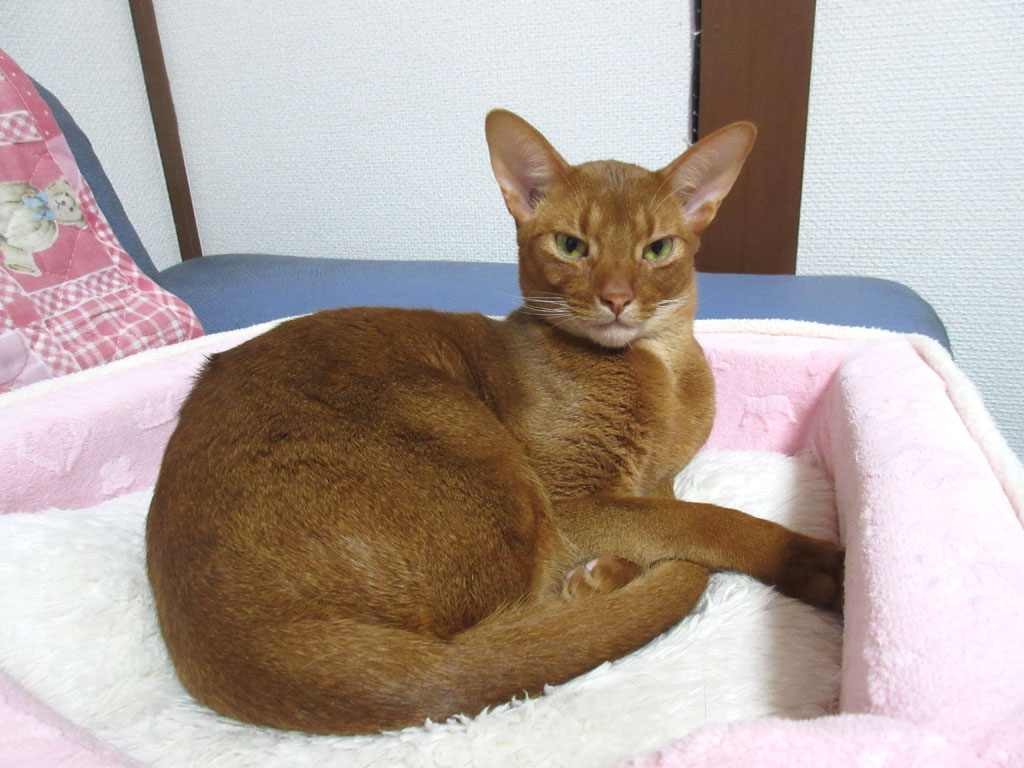 この顔は、ちょっと怖い顔のアビのすけ…、我が家のお笑い担当のアビのすけですが、アビシニアンって、どの子も顔の模様が怖く見えるんですよね。