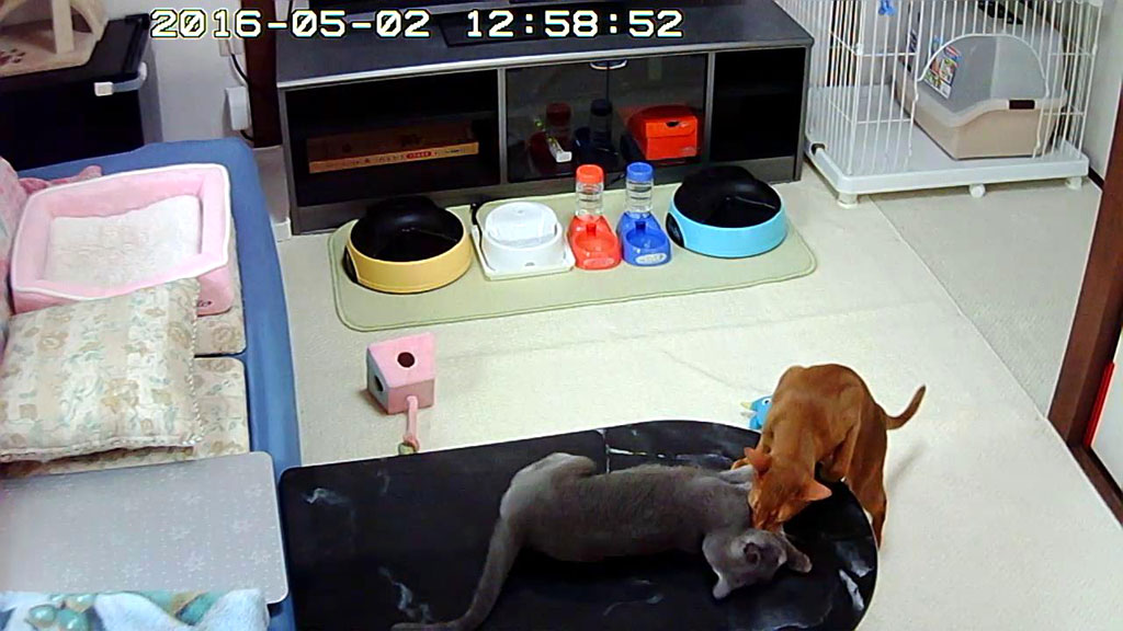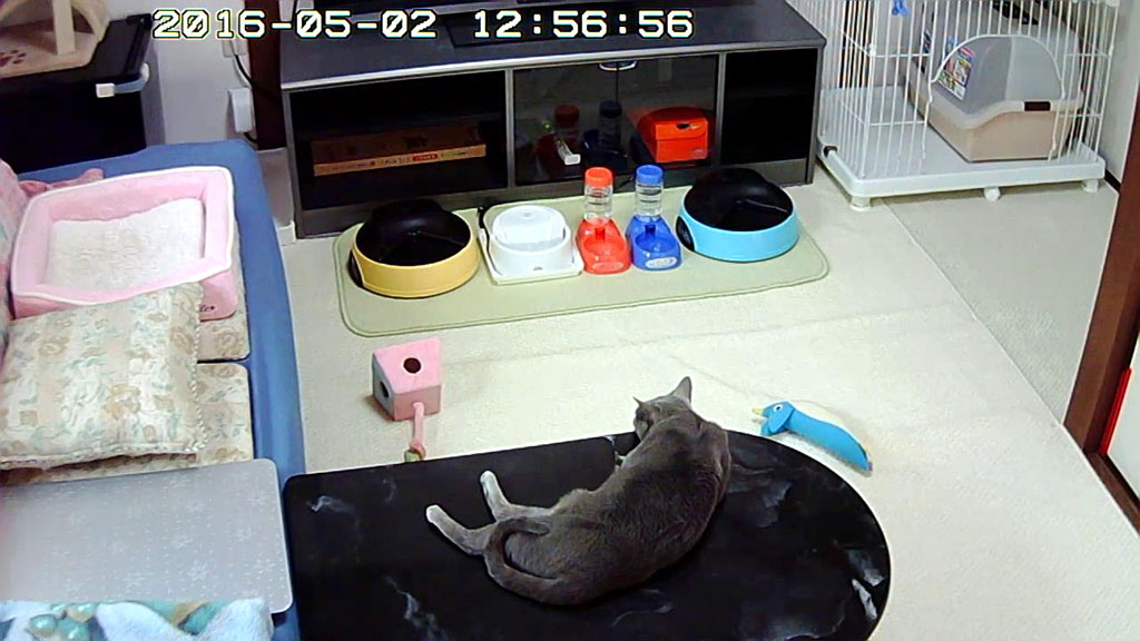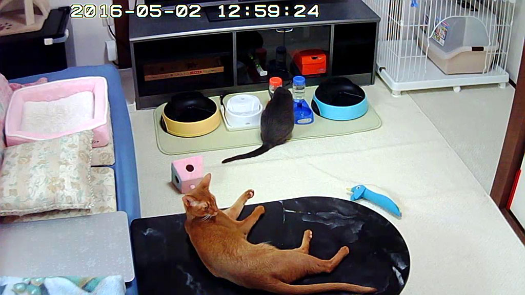 それら一連の流れから、毎月初の、自動給餌器のスタート時間を調整した後の、猫たちのお昼ご飯の様子です。