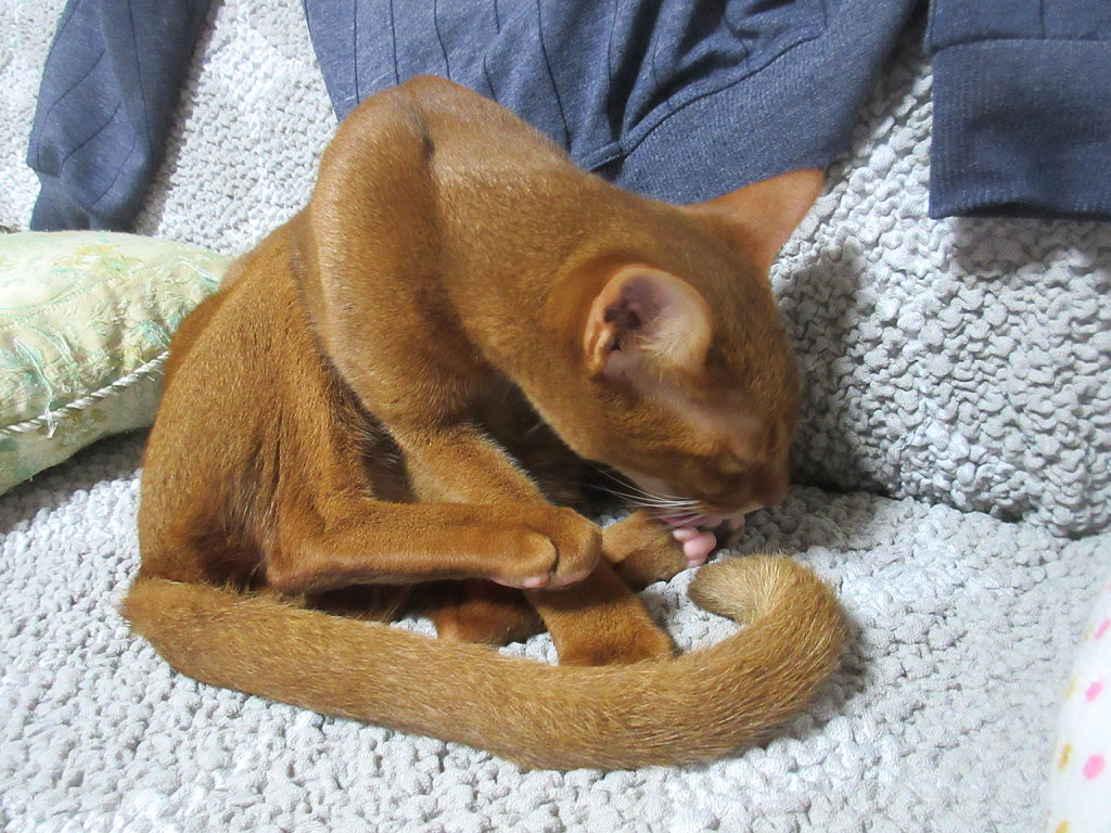 これは、昨日の夜中の12時頃の写真ですが、アビのすけがソファーの上でペロペロしていて…。