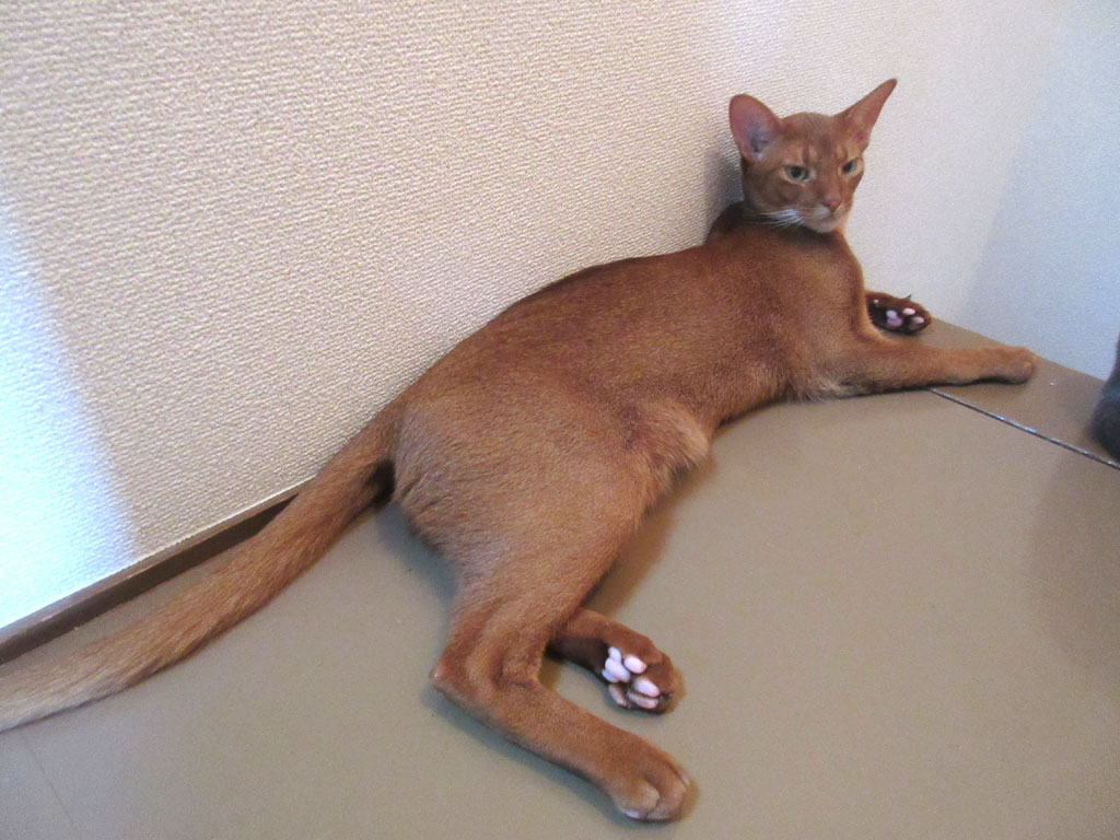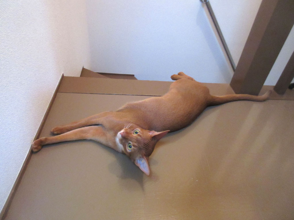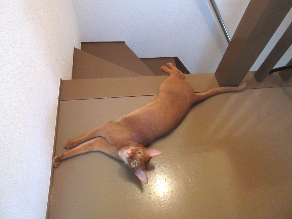 ここは2階の踊り場ですが、とりわけ、アビのすけはよく、廊下やフリーリングの上で転がっているのです。
