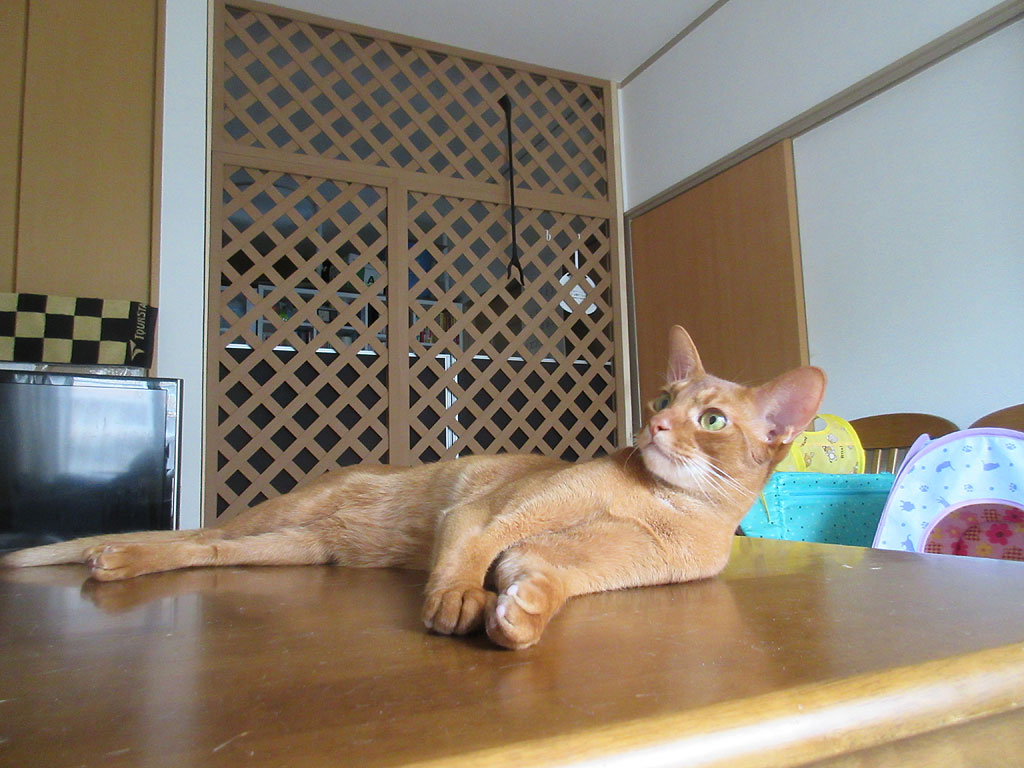 アビシニアンのアビのすけ。写真だけ見たら、とってもリラックスをして、落ち着きのある猫ちゃんに見えてるなぁ〜…、実際にも、早く落ち着きのある猫ちゃんになって欲しいって思っています。