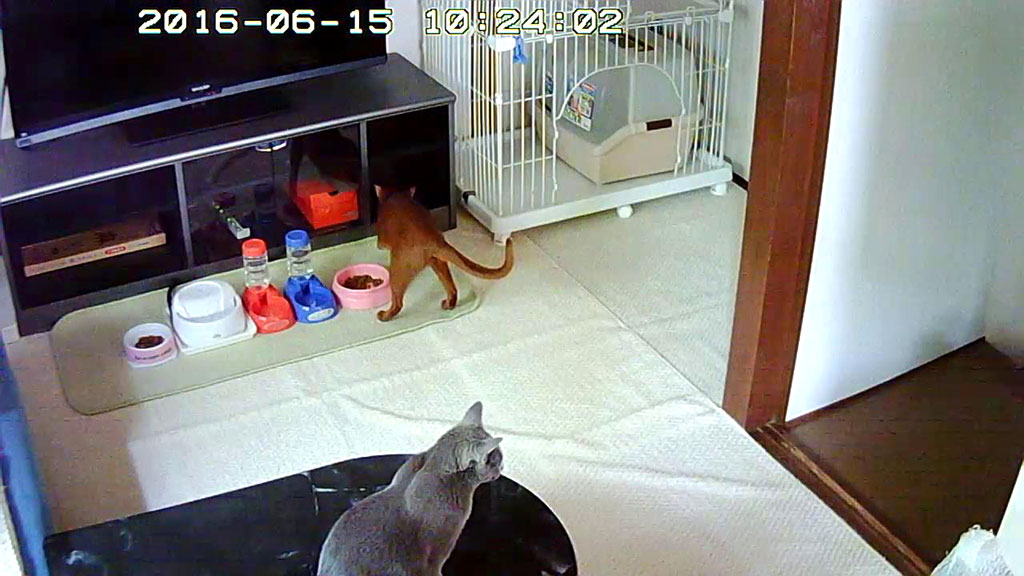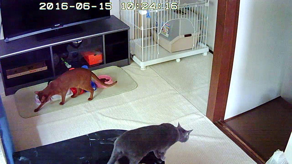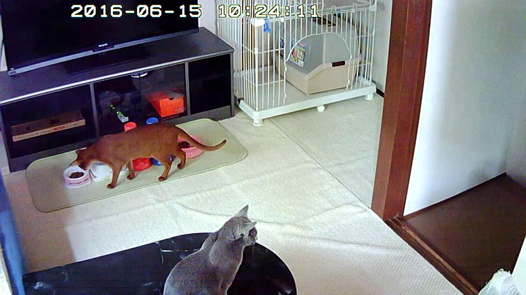 食べたい時にいつもで食べれる状況に我が家の猫たちをさらした事がないので、晩になるまでにアビのすけがロシ子の分までご飯を食べてしまうのではないかって、ちょっと不安で…。