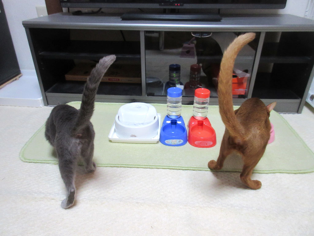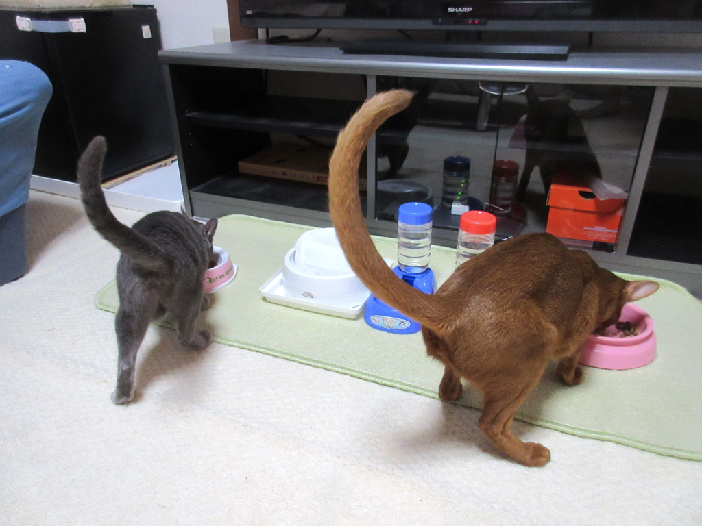 尻尾をピンの猫たち。これ、昨日の猫たちの晩ご飯の風景…、2にゃんとも、尻尾をピンと立てて、まるで座る事もすっかり忘れている様な感じで、この体勢のままで数分間、晩ご飯を食べ続けていたのです。