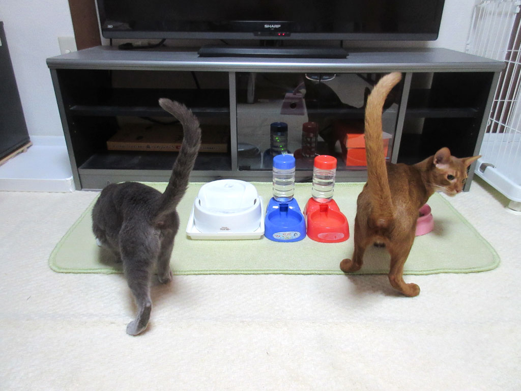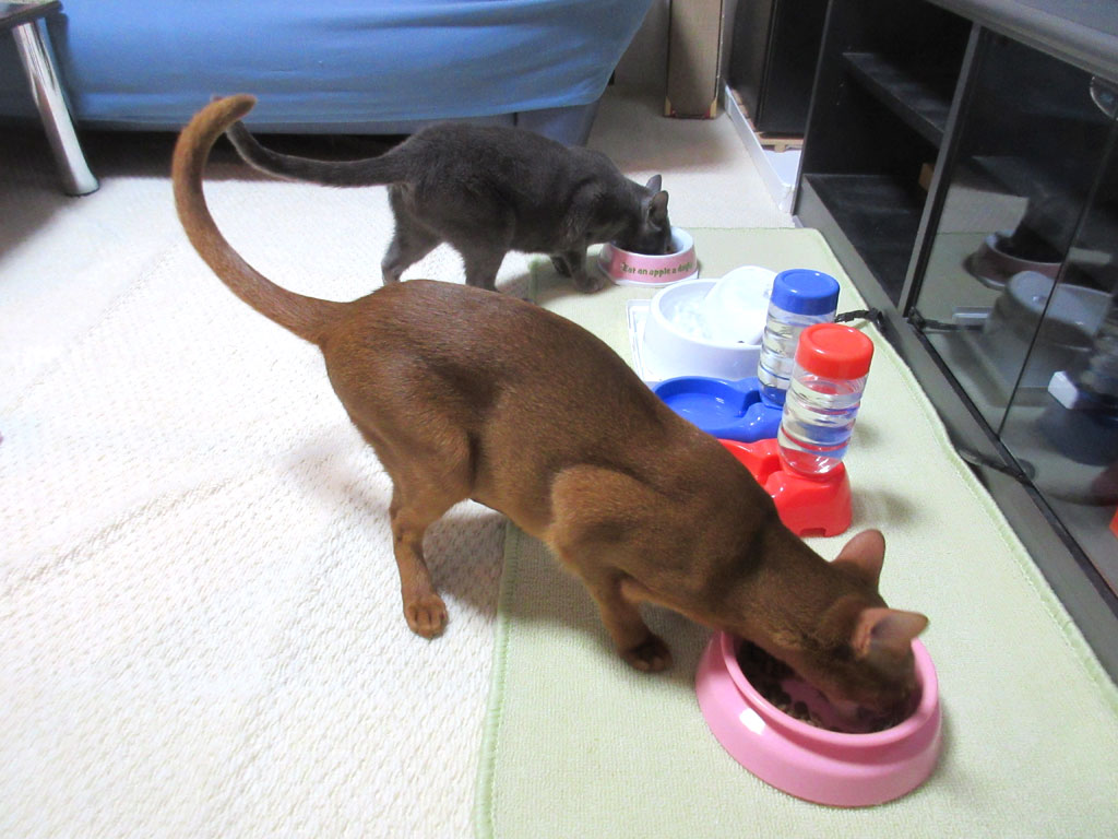 このままのポーズの猫たち。ほんとこのまま…、ロシ子は左足を下げた体勢で、アビのすけは右足を下げた体勢で、まったくこのままの体勢で晩ご飯を食べ続けてて、私も猫たちのこの様子にあっけに取られてしまいました。