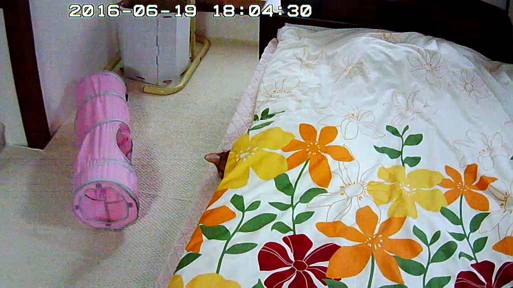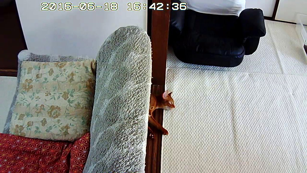 そしてこれはその翌日、今日から言ったら3日前の写真ですが、この日は確か暑くって、Webカメラで猫たちの様子を見たら、アビのすけがベタッと、ここで倒れる様に寝ていたのです。