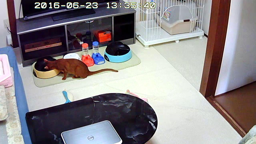 ロシ子がアビのすけの自動給餌器に。これはその日の昼ご飯の時の事ですが、一応、2にゃんともご飯を食べ終わって、この場所を離れていたのですが、ロシ子がふらっとやって来て、アビのすけの自動給餌器に顔を突っ込んで…。