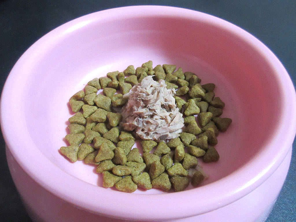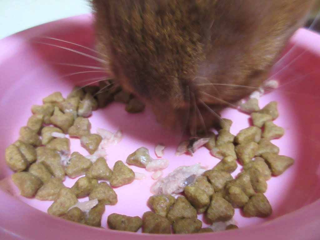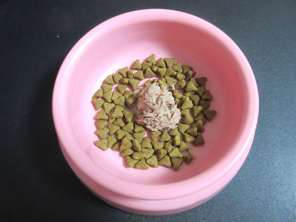 パウチを盛りました。盛り具合はこんな感じで、まぁ、一気にここからアビのすけは食べて行くでしょう。