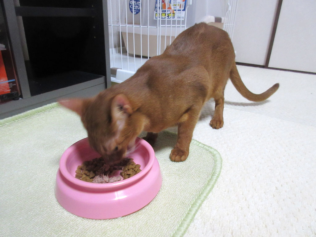 きれいにパウチを食べるアビシニアン。アビのすけ、見事に真ん中から食べましたね。