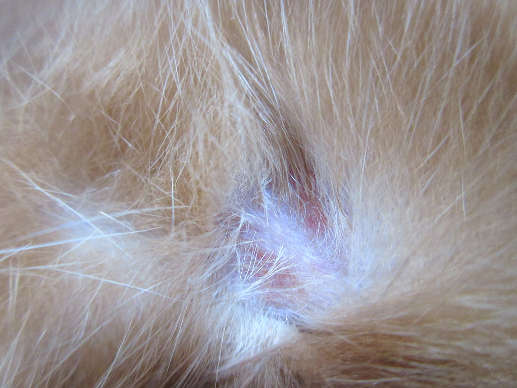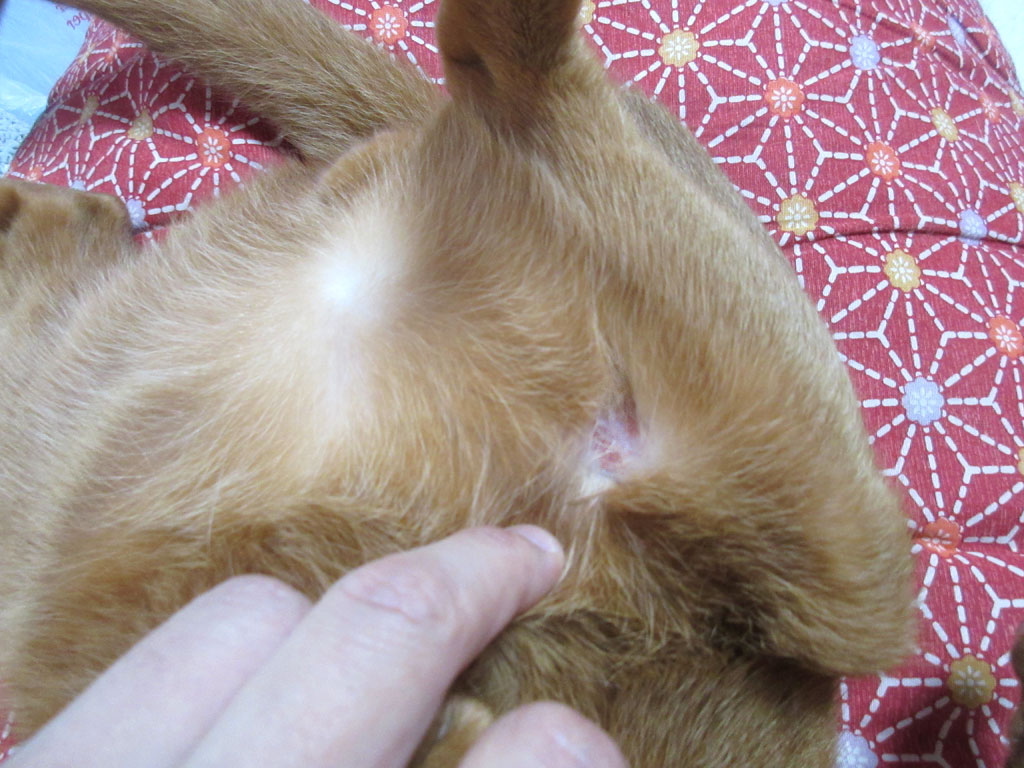 すると、お腹から足の付け根の辺りをブラッシングしていたら、ちらっと赤い部分がある事に気付いて、よ~く見てみると…。
