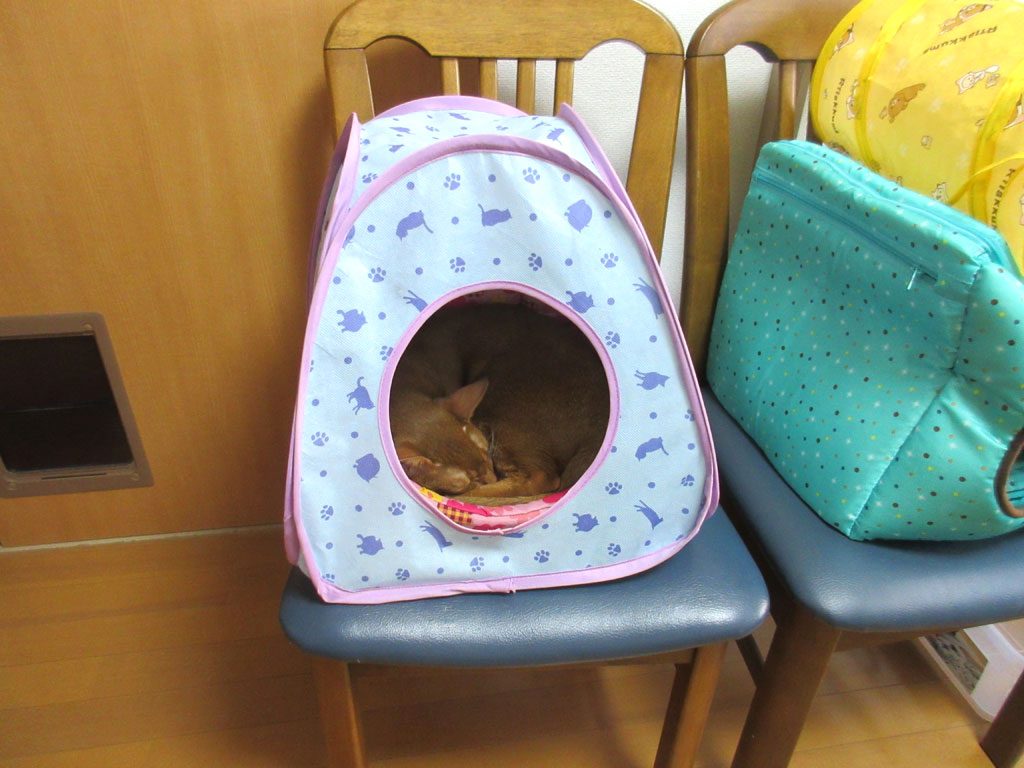 珍しく今日は、キャットタワーのにゃんモックではなく、このキャットテントの中で寝ていたアビのすけ…、エアコンが強すぎて寒かったのかなぁ〜…。