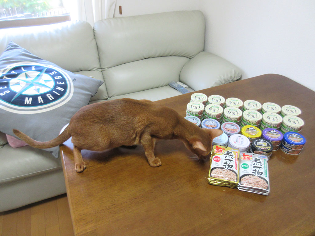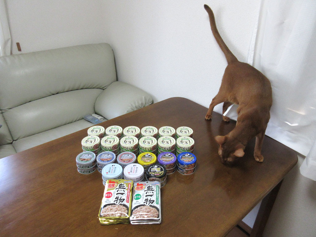 これ、3日前の我が家の様子ですが、この日、開封していなかった荷物を一気に開けて、整理をしていたのですが、「たまの伝説」の缶詰と「無一物」のパウチを整理していたら、アビのすけがやって来て。