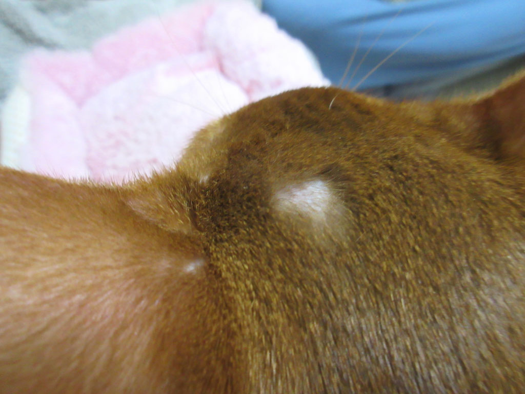 アビのすけのハゲ。特段、かさぶたの様な物も見当たらないし、これ、もしかして、マラセチア性皮膚炎…?