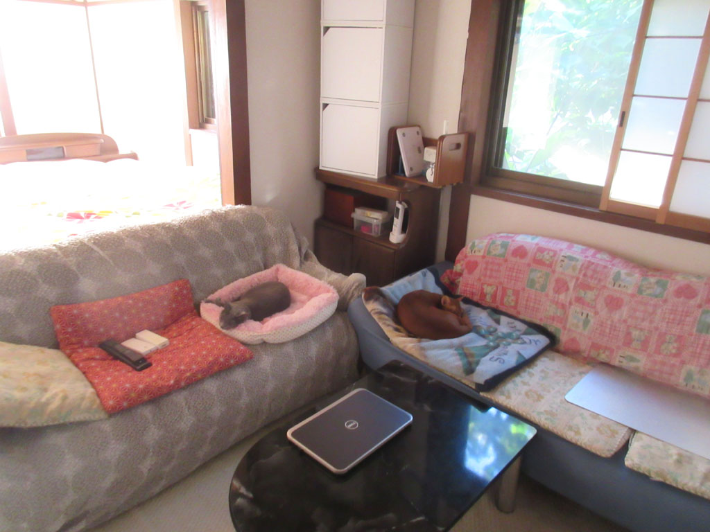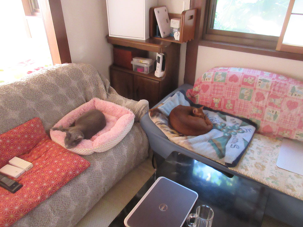 ここで寝ている猫たち。この数日は、朝晩はかなり過ごしやすくなって来て、朝なんかはエアコンを付けていないからか、猫たち、私の枕元では寝てくれず、2にゃん揃って、ここで寝ているのです。
