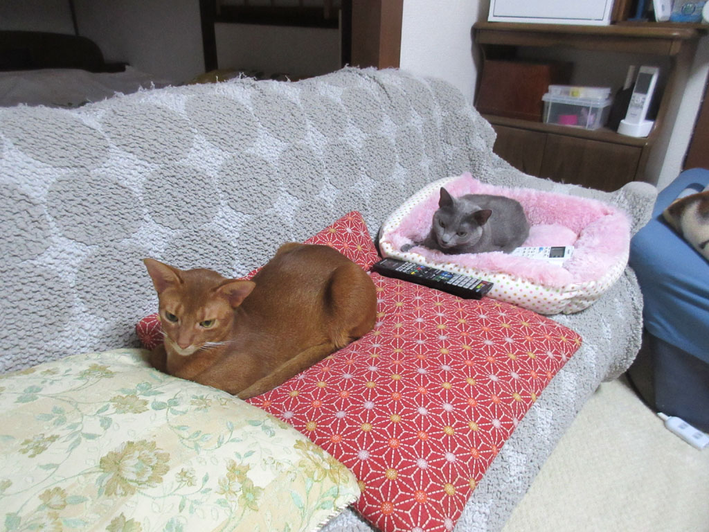 仲良くしてちょうだいよ。そしてこれは、その日の晩の我が家の2にゃんの様子…、ロシ子がここにいるのは分かるのだけど、アビのすけがここにいるのは珍しい…。
