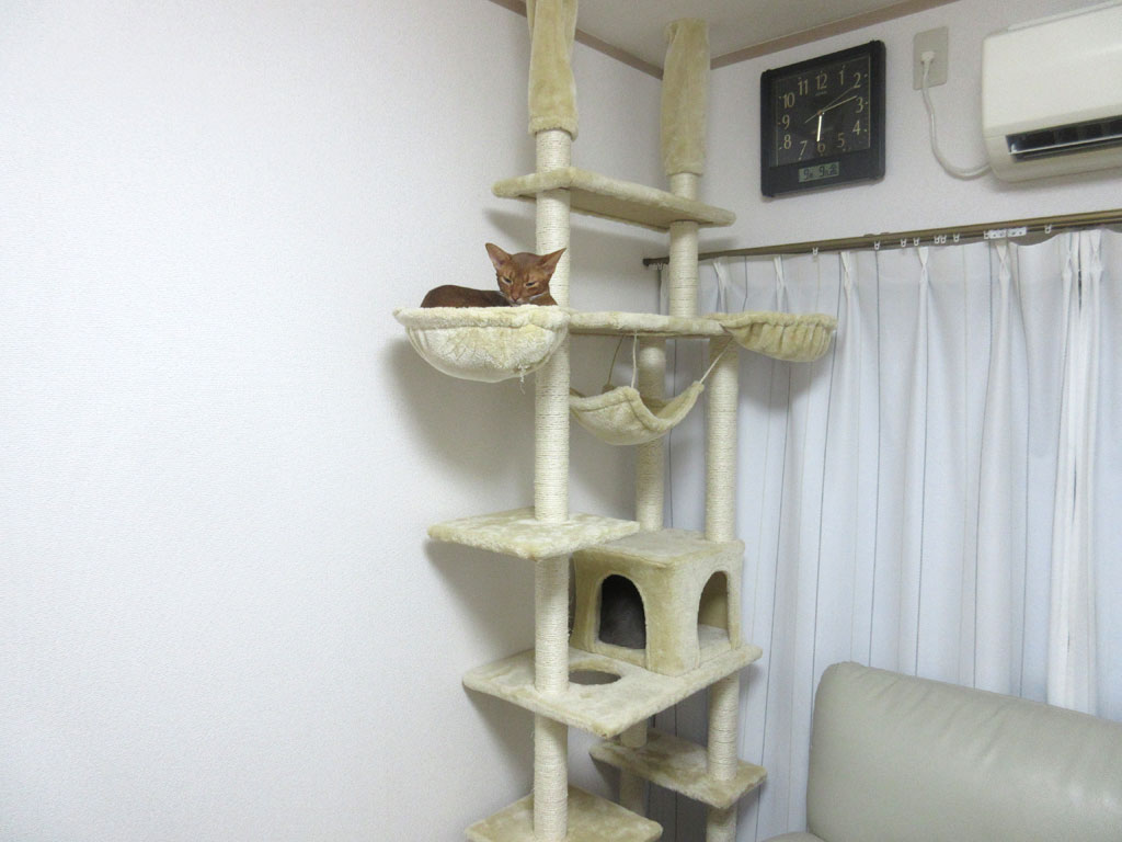 眠そうな顔をしているアビのすけの様子が、しっかりとこの家で寛げている証なので、ほんと、このキャットタワーを買って良かった…。