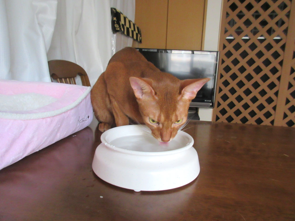 男の子と女の子との違いだと思いますが、ロシ子はとってもお上品に、ほとんど音を立てずに、そして、お皿の中央ではなく、お皿の端の方でペロペロと水を飲むのに、写真にも写っていますが、アビのすけはお皿の外に水を飛ばしまくって、べチャべチャと凄い音を立てて水を飲むのです。