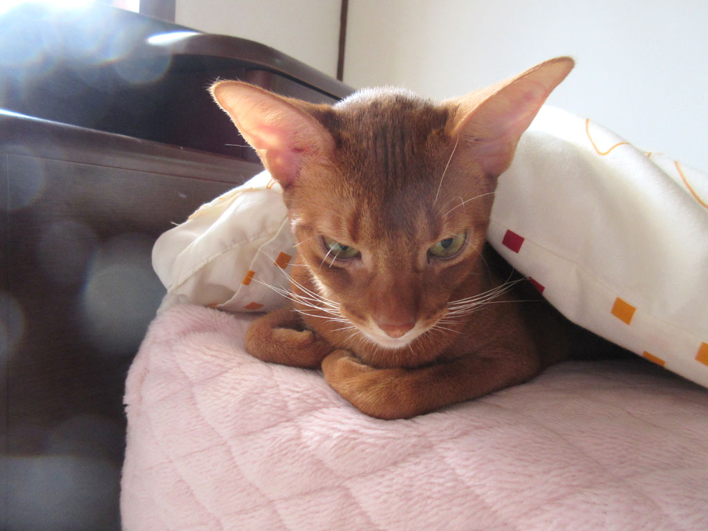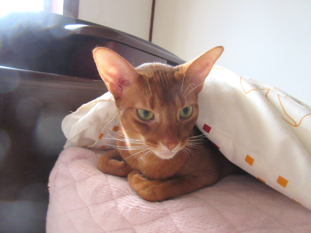 これは、昨日の朝のアビのすけの様子…、この2日ほど、私は朝、寝坊をしていて、かわいくアビのすけは私のベットにやって来て、ゴロゴロ、スリスリ、してくれたのです。