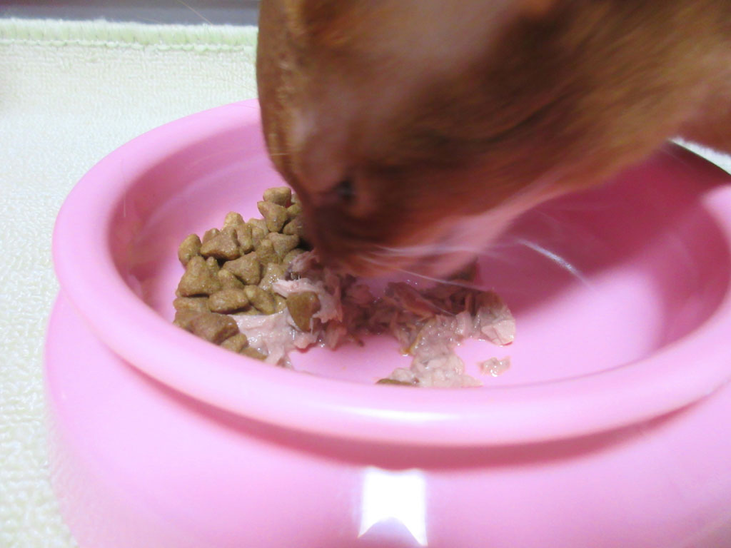 昨日は、ロシ子が我が家にやって来て、丸3年と6ヶ月になった記念日だったので、パウチの美味しい晩ご飯をアビのすけにも出してあげたのですが、この通り、アビのすけは本当にご飯が大好きなのです…!