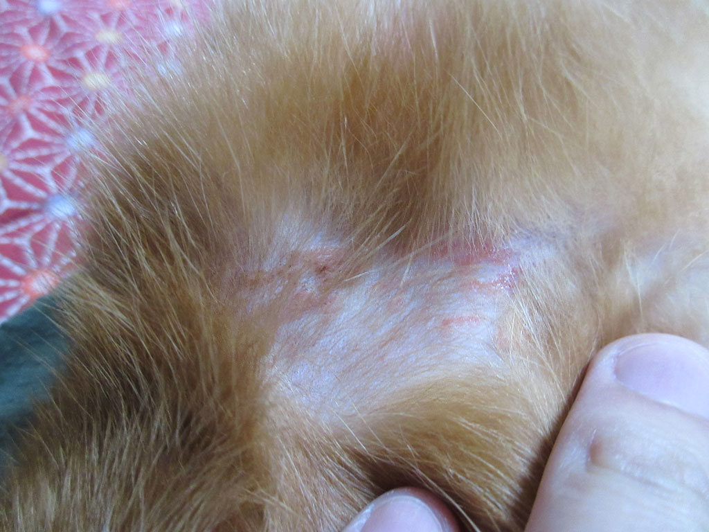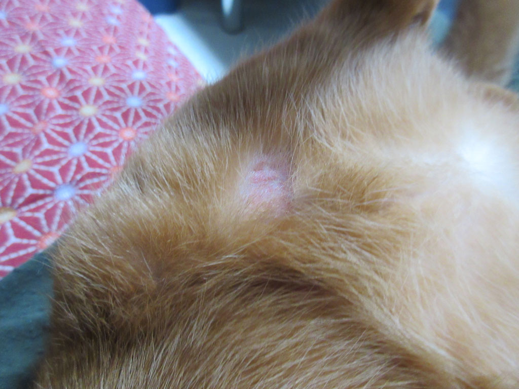 よ〜く見ると、アビのすけの左肘のちょっと先の二の腕辺りに、こんな感じの皮膚炎が出来ていたのです…、ショック…。