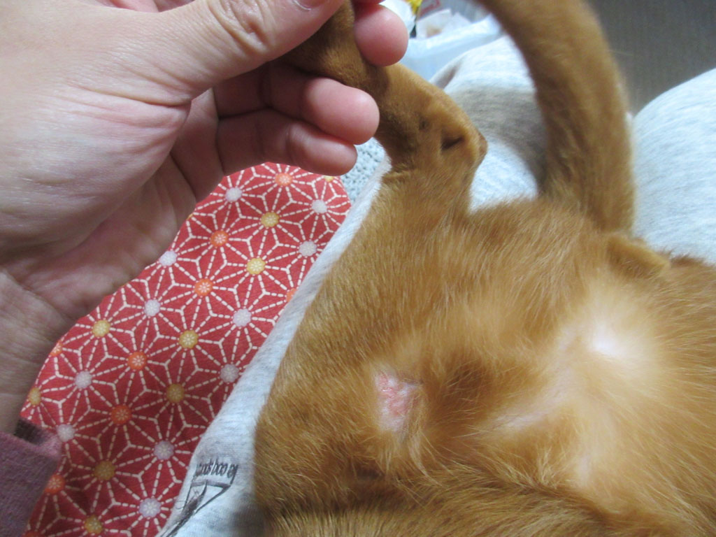 こちらも、それ程、良くもなっていない様に感じますが、5日前のアビのすけの皮膚炎の状況に比べると、ちょっとは赤みが薄らいで来てるかな…。