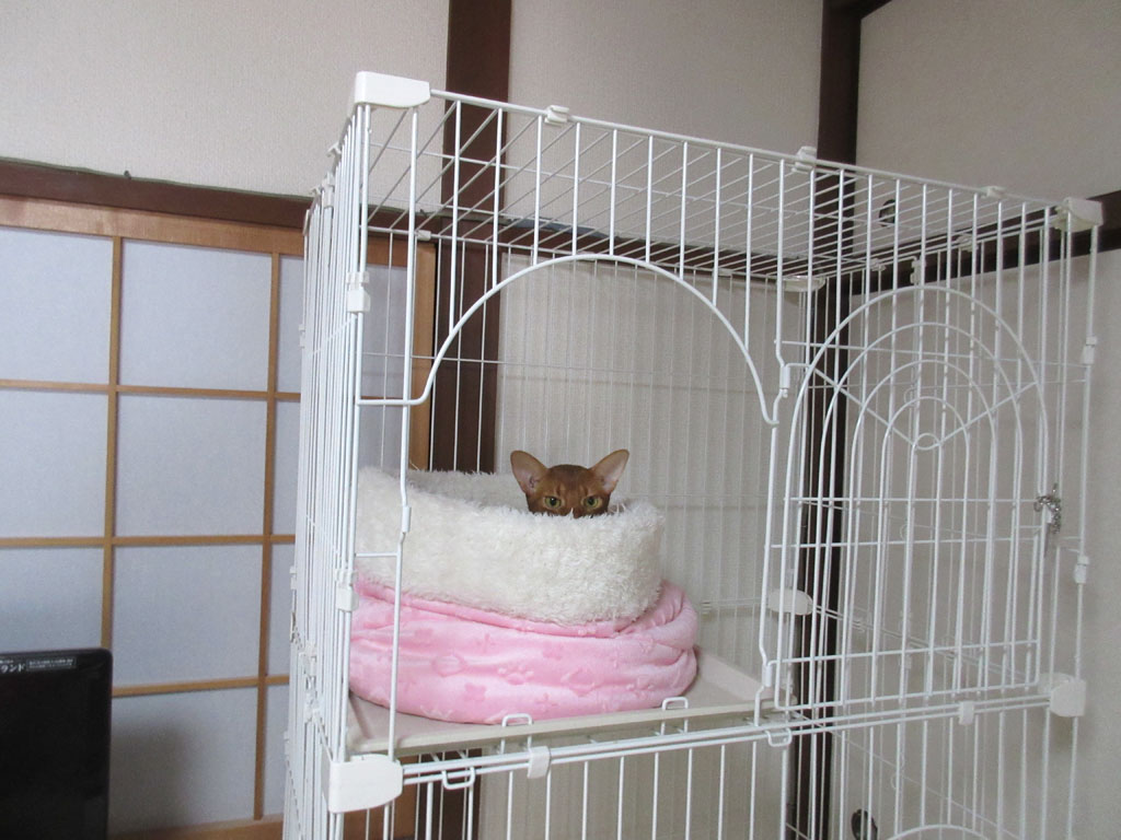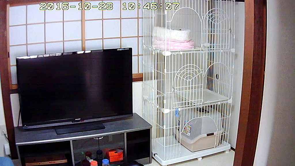 そして、午前11時前に、猫たちの様子を確認しようと、Webカメラを見ていたのですが、この写真、一見、猫たちはどこにもいない様に見えるのですが、よーく見てみると、ケージの3階の猫ベットから、ちょっとだけ耳が見えてて…。