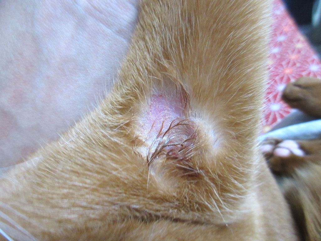問題は、このアビのすけの左足の膝頭辺りに出来た皮膚炎…、こちらは後発なので、まだまだ酷い状況だったなぁ〜…。