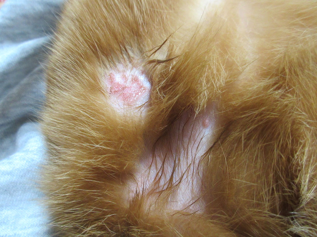 そしてこれは、アビのすけの左足の皮膚炎の状況…、右下側の部分は、アビのすけの左足の付け根辺りから続く皮膚炎の部分ですが、ここはかなりましになっていましたが、念のためにモメタオティックを。