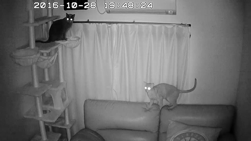 晩、こっちの部屋は電気を付けていないのですが、暗闇大好きな猫たちは、目を光らせながら遊んでいました。