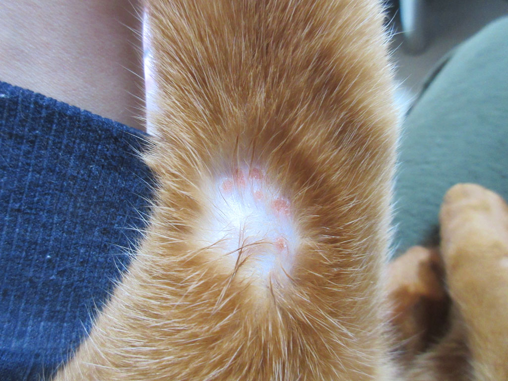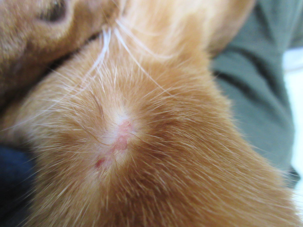 まずは、当初から出来ていた、アビのすけの左足付近の皮膚炎の状況から…、既にモメタオティックを塗った後だと思いますが、皮膚炎がかさぶた化しているので、間もなく治るであろう皮膚炎になってました。