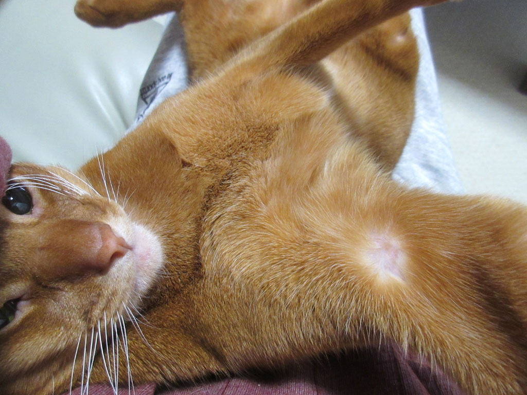 最近、私がとってもバタバタしていて、猫たちのお世話をきっちりとする事が出来てなくて…、昨日の晩、11時過ぎから、ちょっと気持ちに余裕が出来たので、猫たちのブラッシングを始め、ついでに、アビのすけの皮膚炎の状況をチェックしました。