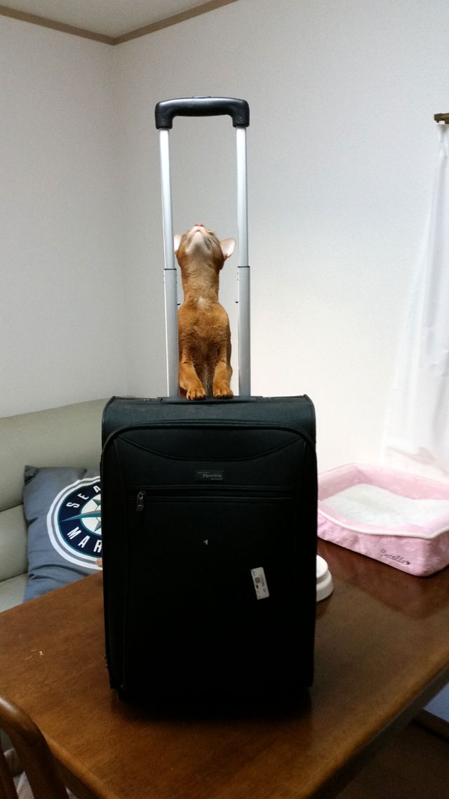 これは、今日のお昼過ぎの事でしたが、旅行中、母親からメールが来て、新しい布製のキャリーバッグを買うとの事だったので、私の不要なキャリーバッグはどうですかとの事で、スマホで写真を撮って母親に送ってあげようと、キャリーバッグを取り出して来たのですが、我が家のおっちょこちょいのおバカさんが、速攻、やって来たのです。