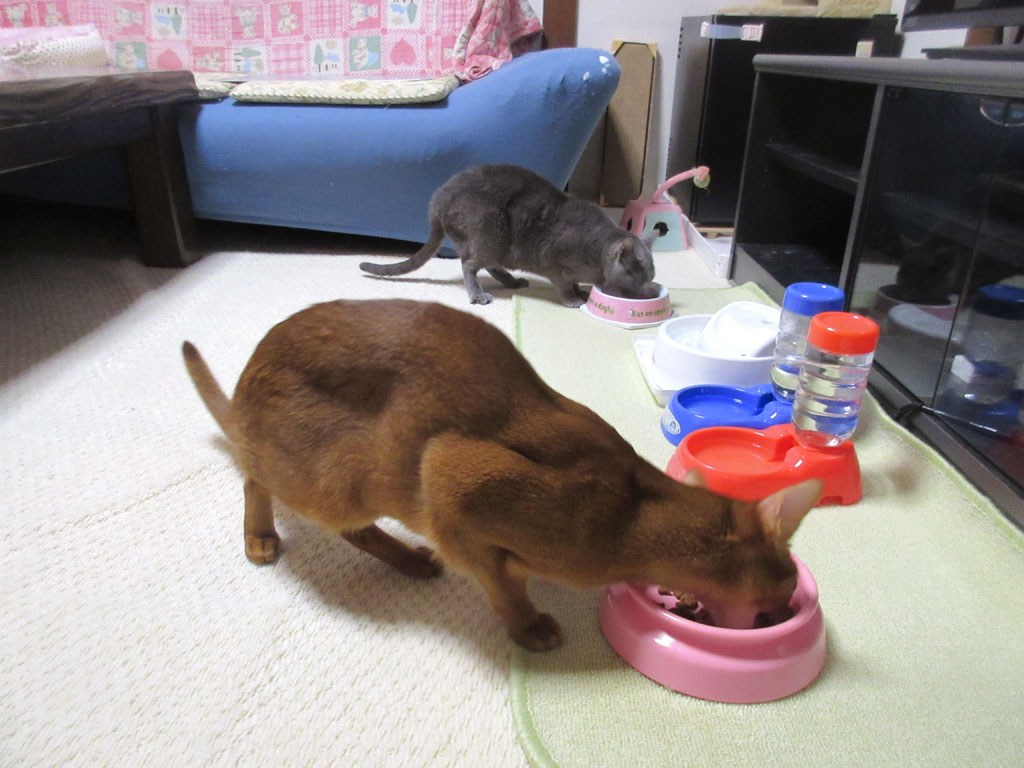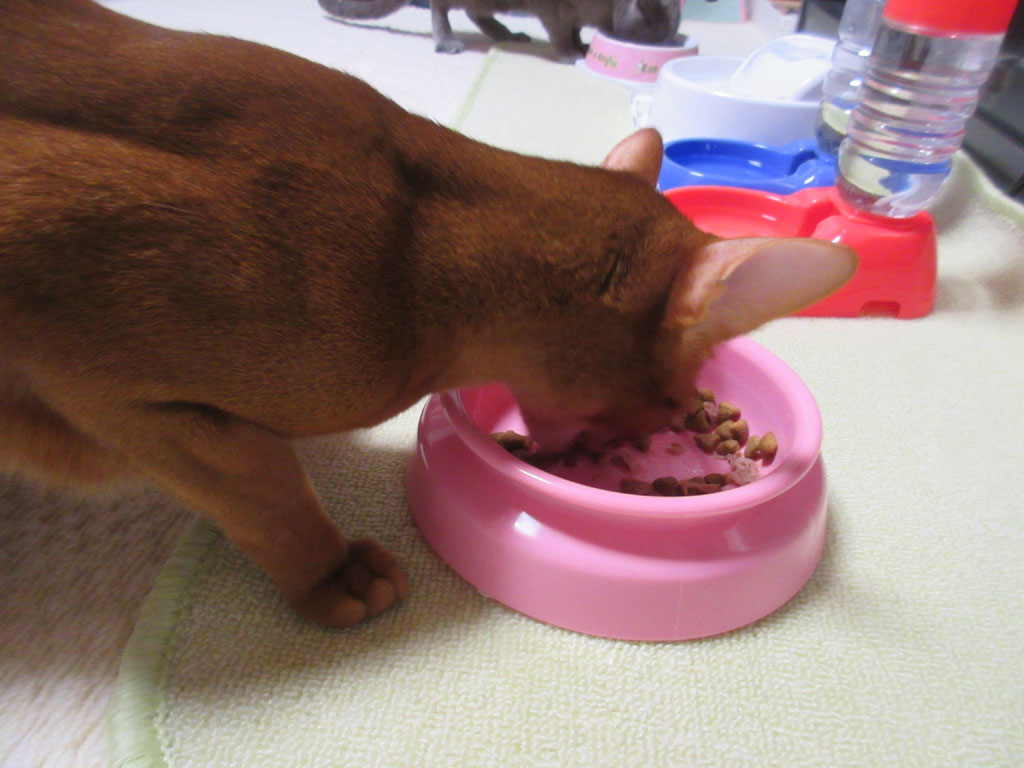 ご飯を出してあげる前には、毎回、必ず猫たちと鼻チューをしてからあげてるのですが、アビのすけの場合は大変で、もう、ご飯が欲しくて大騒ぎをして、本当にこの子は食べるのが大好きで…。
