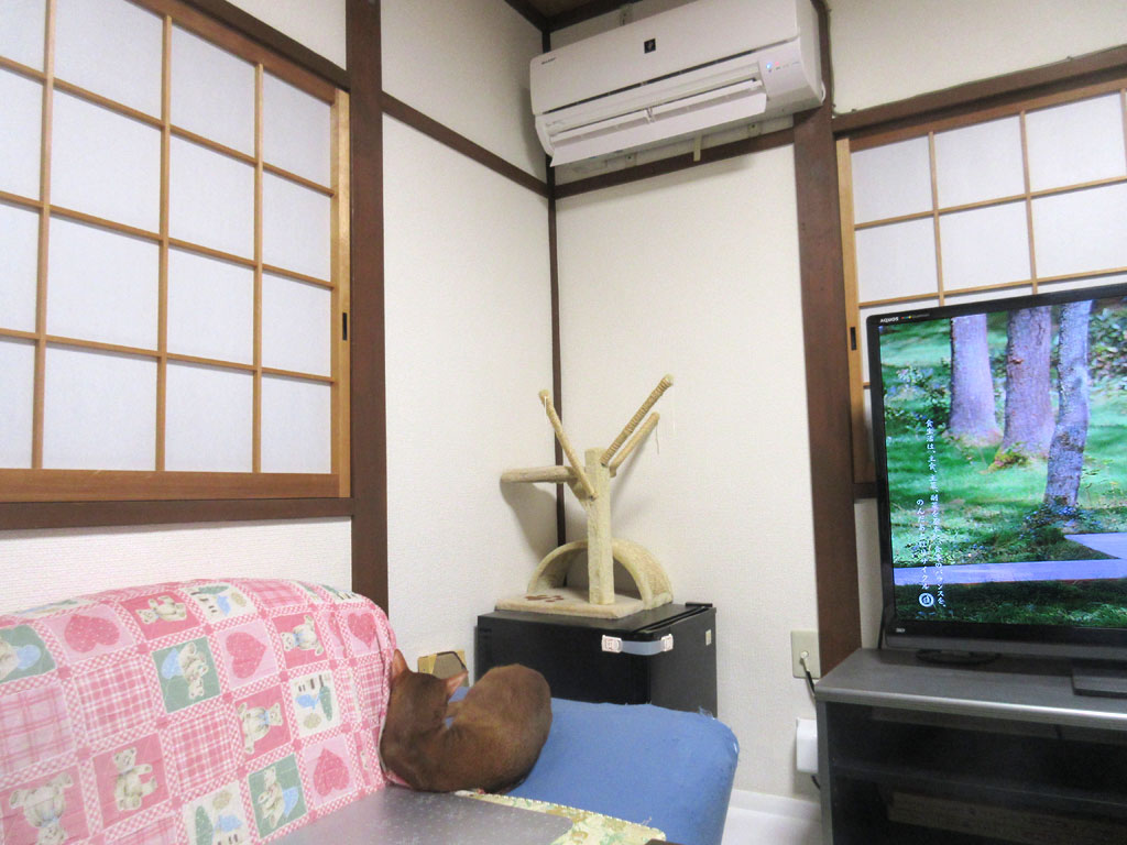 これは、おとといの晩の事なので、私が釜山旅行から帰って来た翌日の晩の事ですが、エアコンを付けると、アビのすけが温風を直撃で受ける事が出来るこの場所にやって来て、寛ぎ始めたのです。