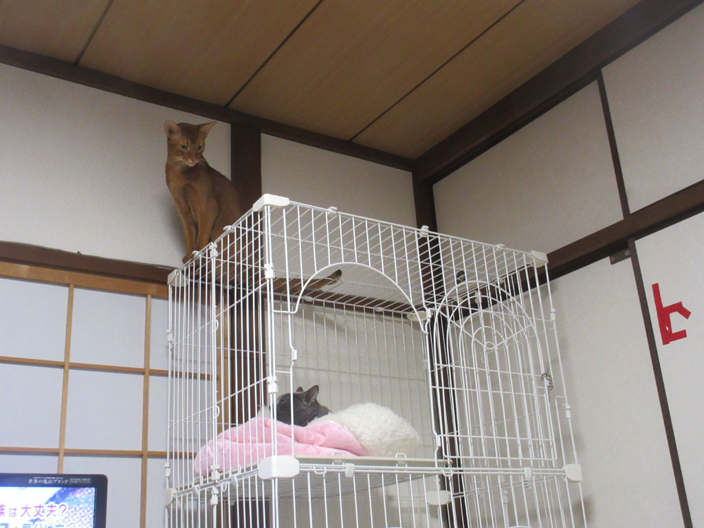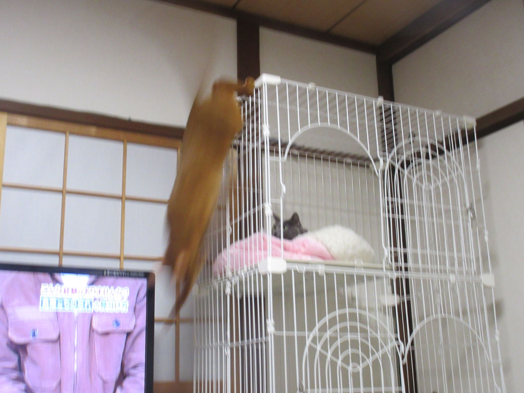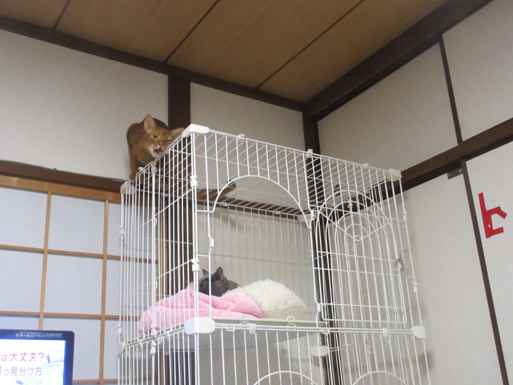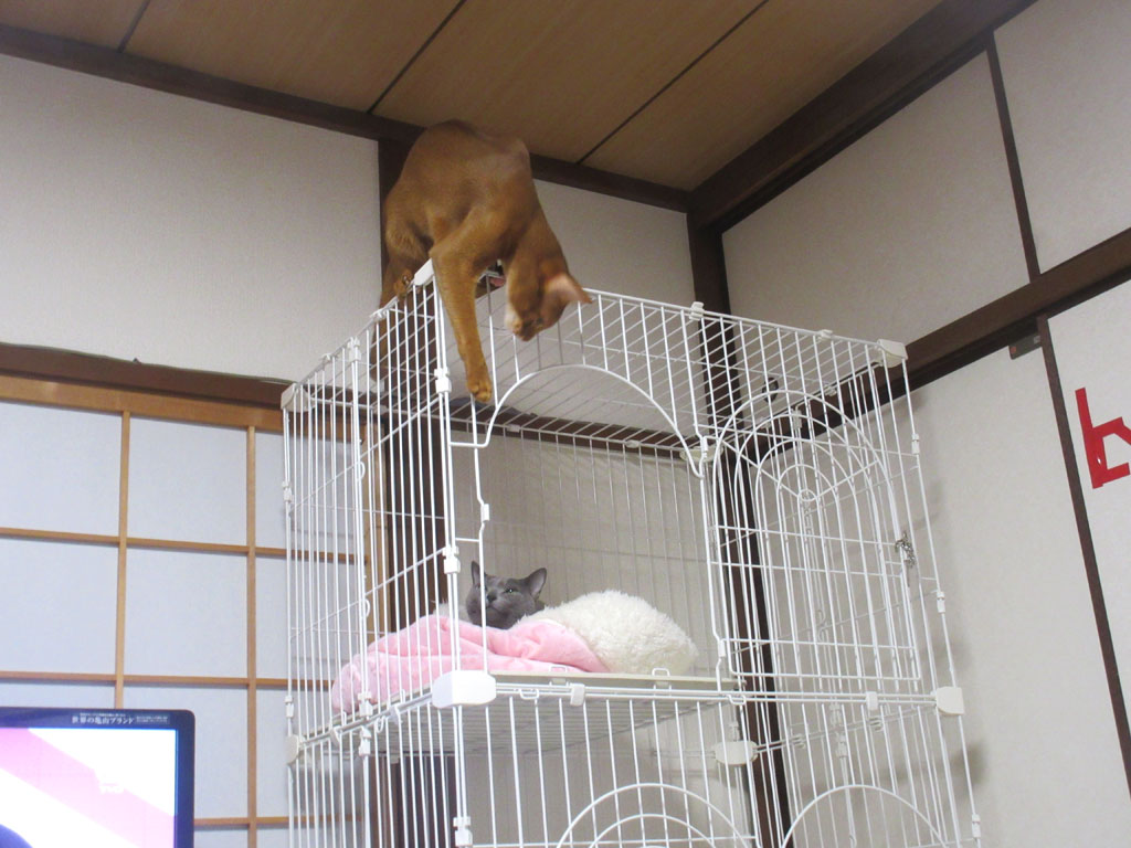これは、3日前の晩の事ですが、この日もアビのすけはやんちゃ盛り…、ロシ子がケージの3階の猫ベットで寝ていたのに、そんな事はお構いなしに、大騒ぎして…、こらっ…! この野郎…!