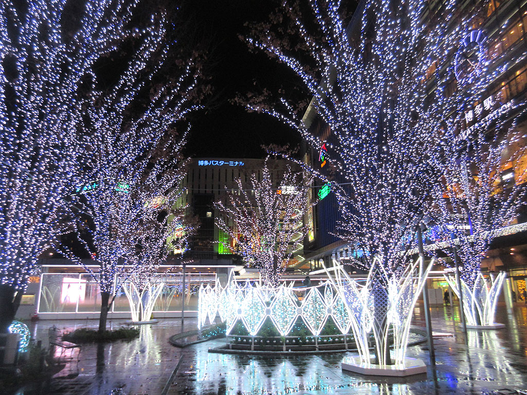 これは、今晩の福岡県は博多駅の博多口の晩の景色…、今晩の8時から、博多から1時間程の距離にあるお客様のお宅にお伺いする為、晩7時頃に博多駅に向かった私でしたが、博多駅が、少し早いクリスマスムード一色になっていて…。