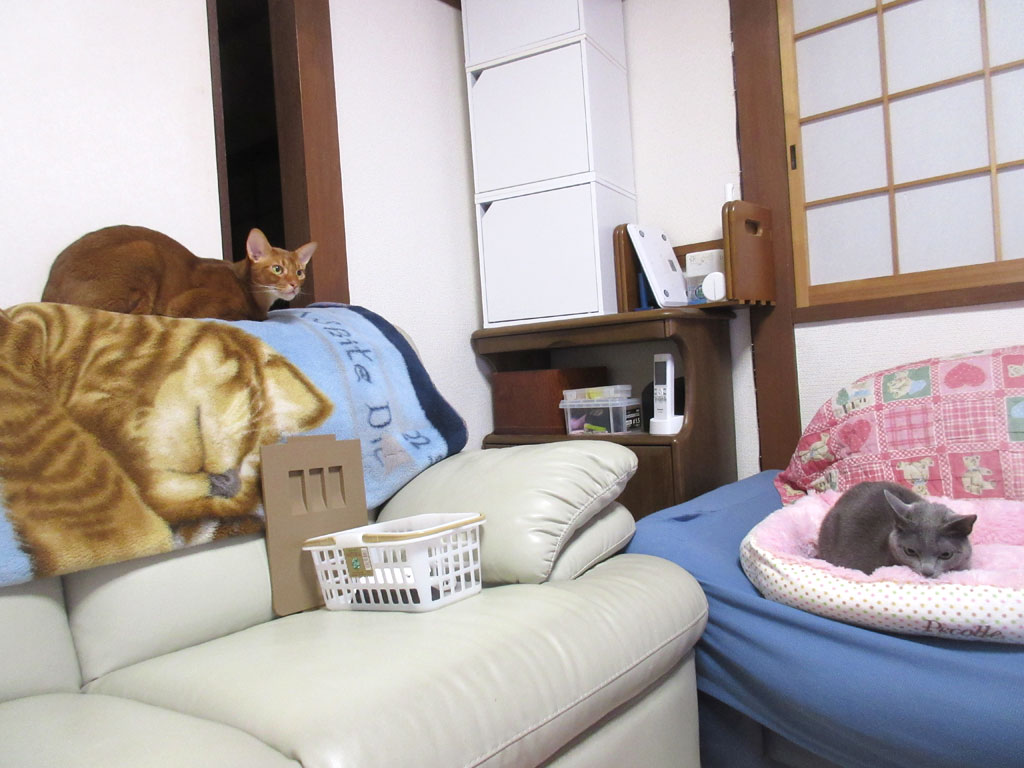 アビのすけ、お前、ロシ子からケージの3段目の猫ベットを奪った上に、また、ロシ子が気持ちよく過ごしていたこの場所を奪ったのか…? てめえ、この野郎…。